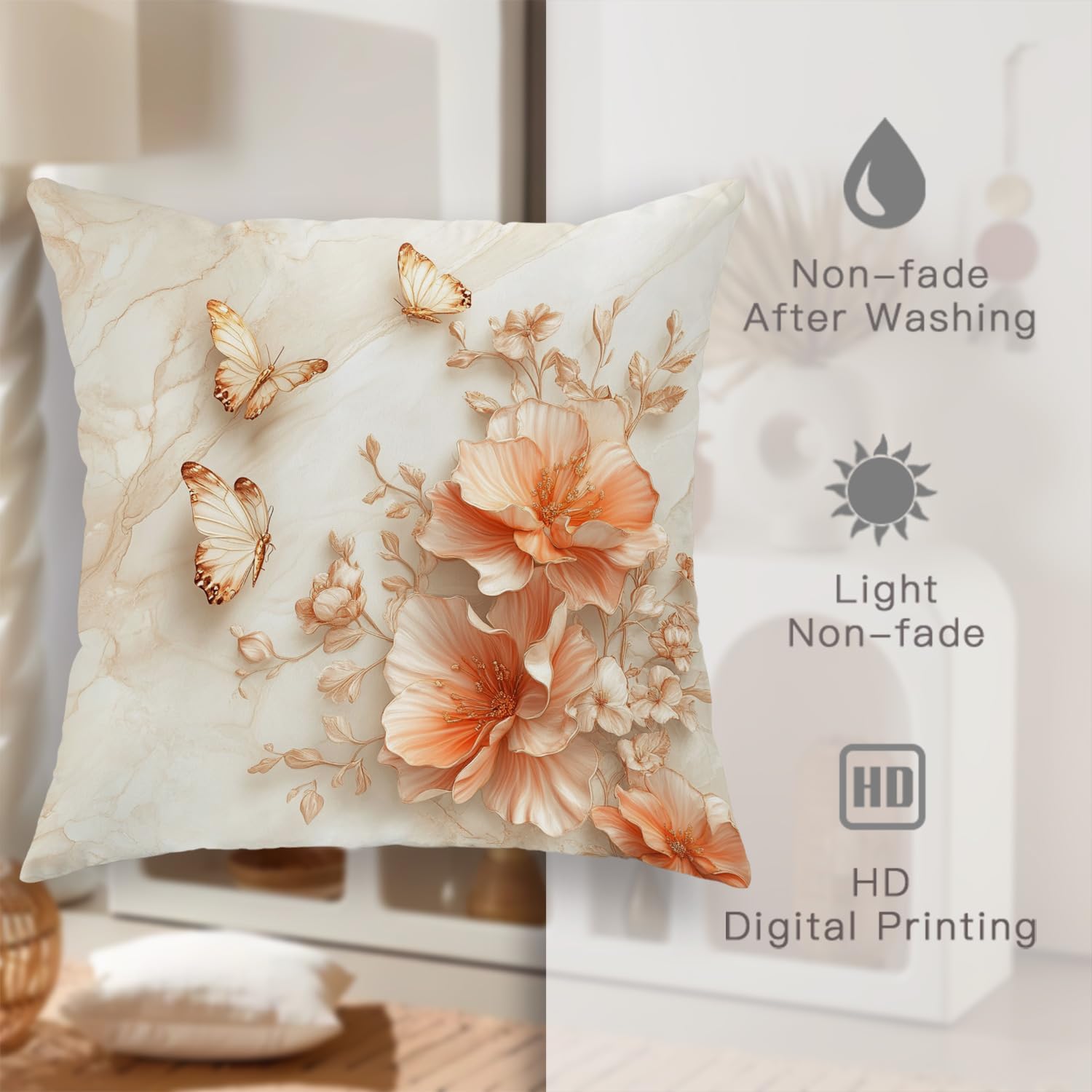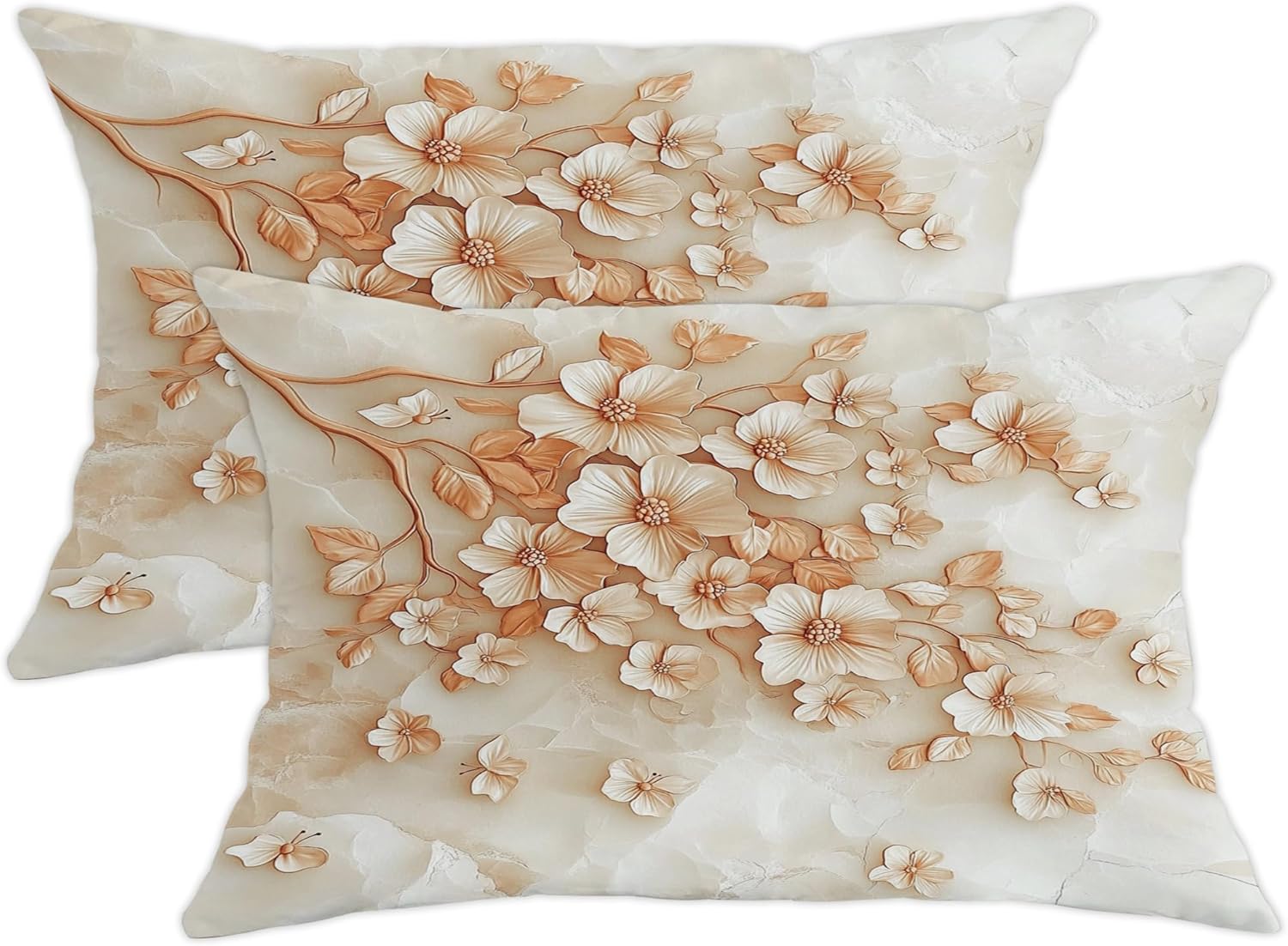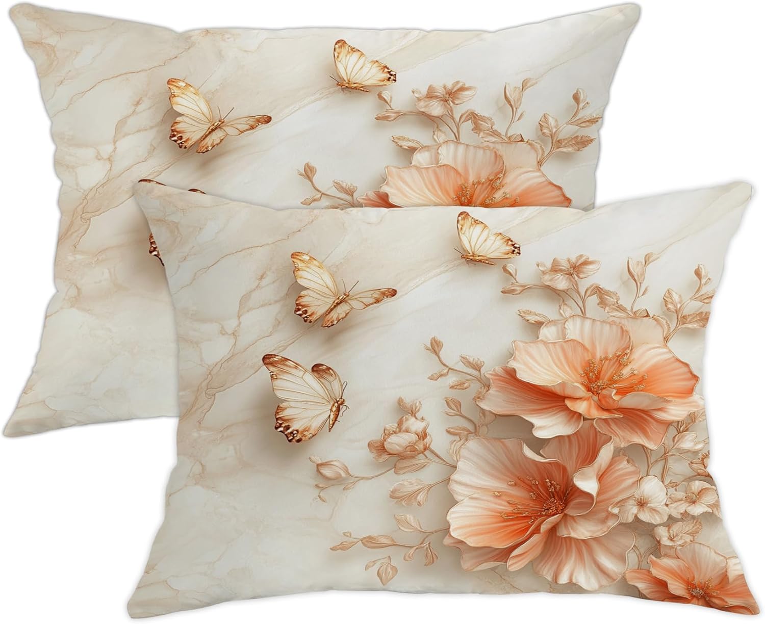 Transform your living space with these exquisite throw pillow covers featuring a stunning design of delicate coral flowers and golden butterflies against a serene marble-like cream background. The elegant floral pattern showcases beautiful peach-colored blooms that seem to float gracefully across the surface, while metallic butterflies add a touch of whimsy and sophistication. Perfect for adding a soft, romantic touch to your bedroom, living room, or sitting area, these decorative pillow covers blend seamlessly with both modern and classic decor styles. The subtle yet striking design creates a peaceful atmosphere while serving as an artistic focal point. These pillow covers offer an effortless way to refresh your home's aesthetic, bringing nature's beauty indoors with their dreamy botanical motif. Please note that this listing is for the pillow covers only; inserts are sold separately.