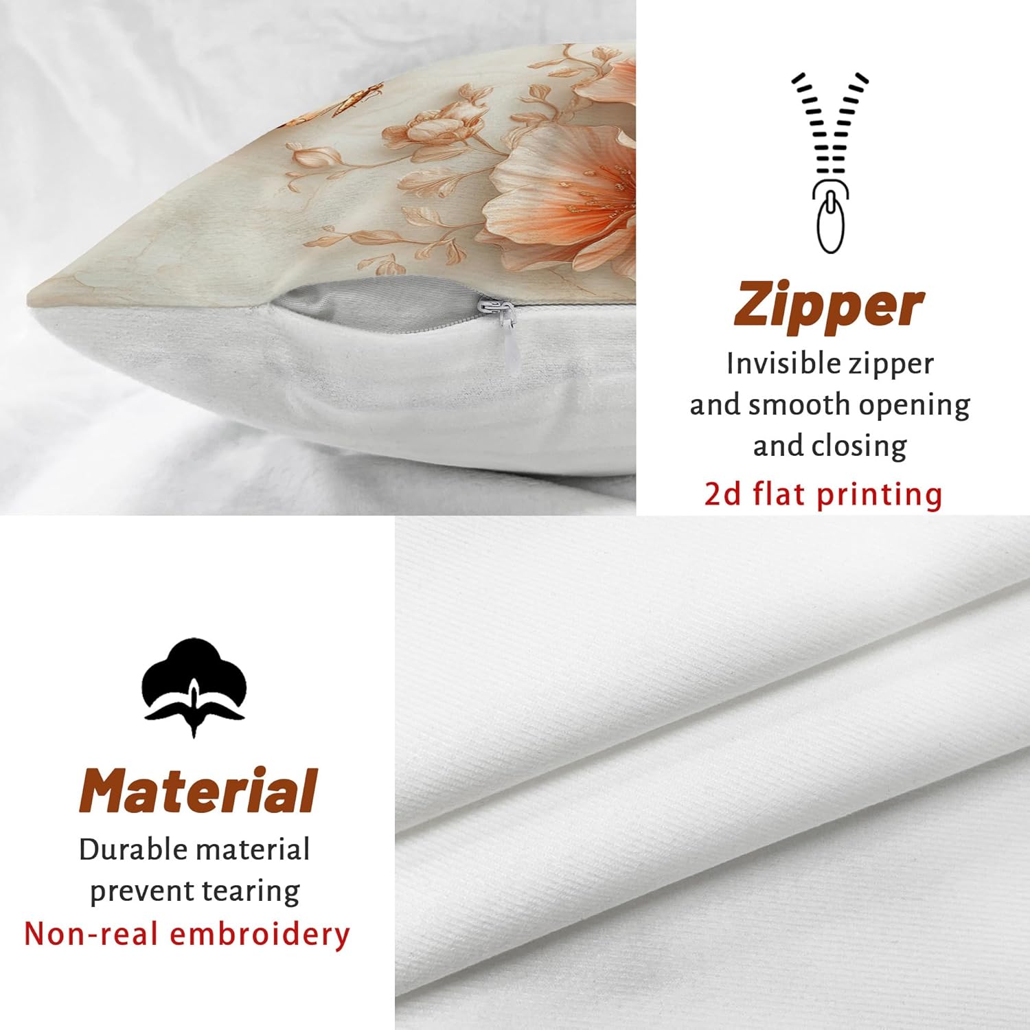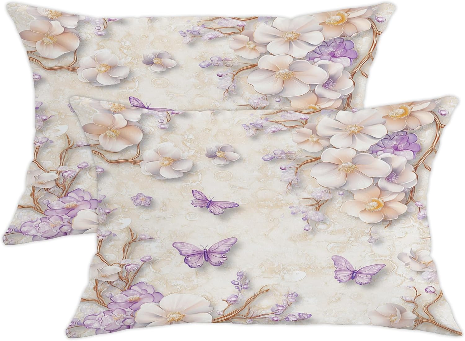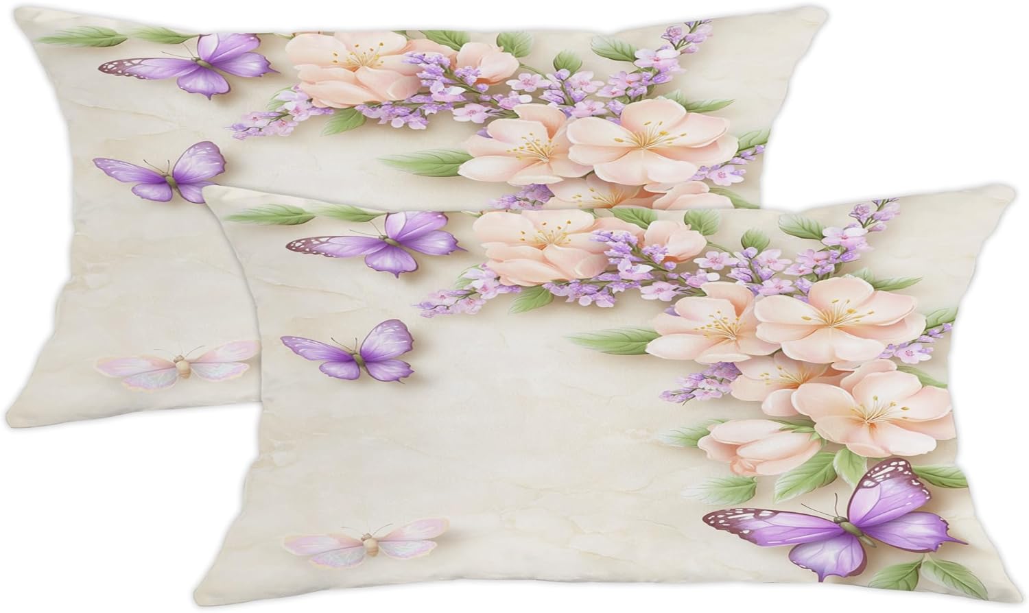 Transform your living space with these exquisite throw pillow covers featuring a stunning design of delicate coral flowers and golden butterflies against a serene marble-like cream background. The elegant floral pattern showcases beautiful peach-colored blooms that seem to float gracefully across the surface, while metallic butterflies add a touch of whimsy and sophistication. Perfect for adding a soft, romantic touch to your bedroom, living room, or sitting area, these decorative pillow covers blend seamlessly with both modern and classic decor styles. The subtle yet striking design creates a peaceful atmosphere while serving as an artistic focal point. These pillow covers offer an effortless way to refresh your home's aesthetic, bringing nature's beauty indoors with their dreamy botanical motif. Please note that this listing is for the pillow covers only; inserts are sold separately.