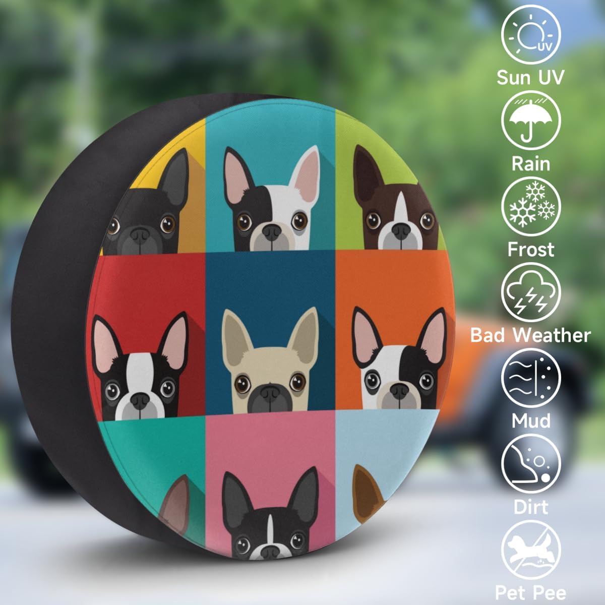 Product size: 14 inches, 15 inches, 16 inches.About Printing:Digital printing technology, single side printing, not easy to fade.Product/Fabric Thickness:Polyester fabric; 1mm thickness.We understand the importance of convenience, which is why our tire cover is incredibly easy to clean. Simply wipe it with water or use a mild detergent for tougher stains, and it will be as good as new. No need for elaborate cleaning procedures or expensive maintenance products—our spare tire bag ensures hassle-free upkeep.The soft and smooth texture of tire covers for cars guarantees that your tires remain scratch-free and undamaged. The fabric's gentle touch prevents any abrasive contact with the tires' surface, preserving their longevity and overall condition. Drive with confidence, knowing that your tires are protected by a cover designed with care.We emphasize precision and quality in every aspect of our tire cover's construction. The reinforced stitching ensures durability and longevity, even when subjected to rigorous use. The neat and tight stitching guarantees that the tire cover holds its shape flawlessly, maintaining its aesthetic appeal.RV spare tire cover shields your tires and wheels from a wide range of potential damages. It effectively blocks harmful UV rays, preventing sun damage and premature aging of the tire rubber. The cover acts as a barrier against rain, dirt, dust, and other environmental factors, keeping your tires in optimal condition and extending their lifespan.If you have any questions about our trailer wheel covers, please contact us. We will reply to you and deal with your problem within 24 hours. Bring you the best shopping experience.