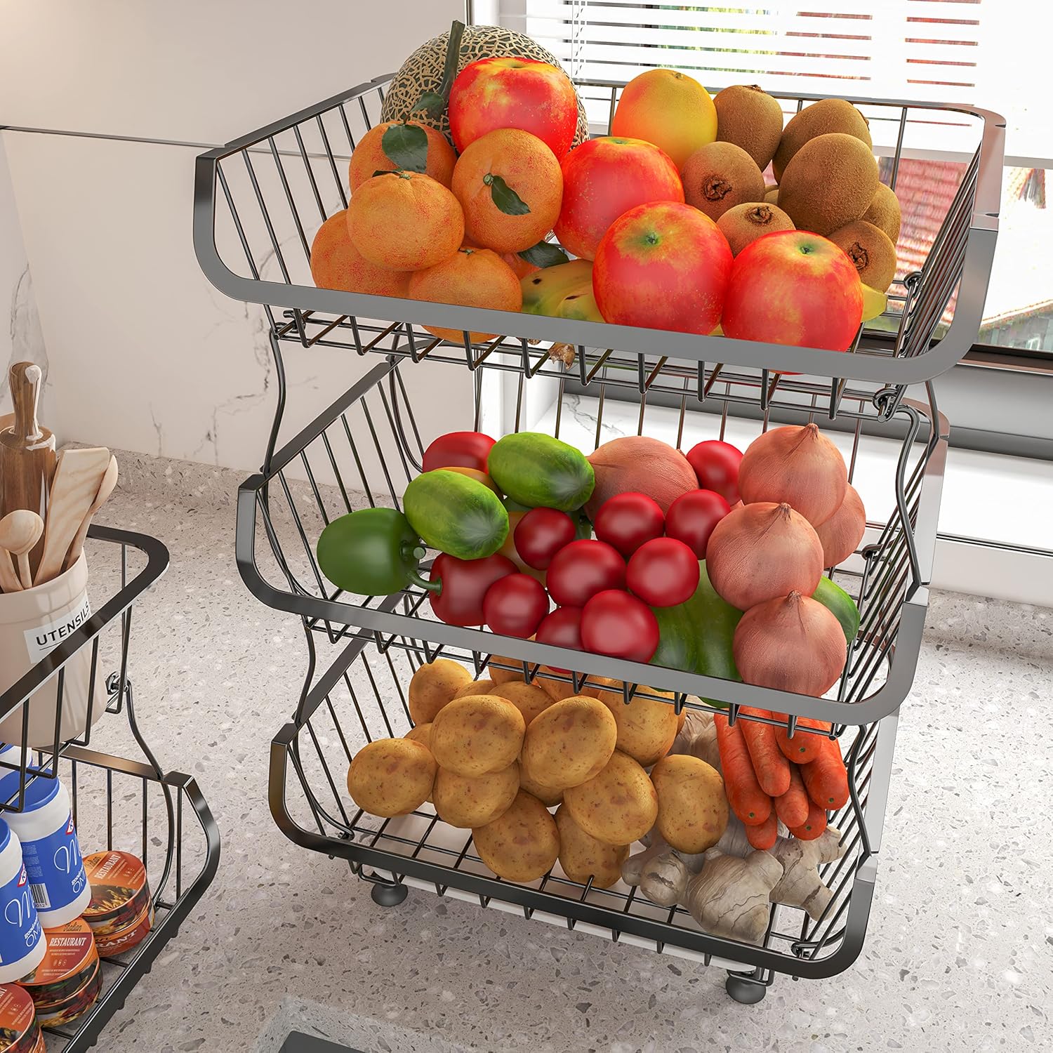 FANWU Multifunctional Stand & Rolling Metal Storage Baskets, Stackable Vegetable Fruit Basket, Utility Cart for Kitchen, Pantry, Bathroom, Bedroom, Garage,Office Thoughtful gift for lovers, families, friends or housewarming party. Large space storage design high quality rolling stackable basket -- Storage basket rack made of durable and high-quality carbon steel metal, strong and rustproof. This functional wire storage bin will meet your long term storage needs. -- Strong load-bearing, load capacity of each shelf is 30 lbs. -- Drainboard to keep the counter or floor clean and dry. This metal basket storage rack comes with a plastic tray under the bottom,aviod mud and dust from potatoes, carrots, or water from freshly washed vegetables and dishes. Easy to assemble as a countertop storage rack or as a utility rolling cart -- Easy to install, package comes with mounting hardware and instructions. No tools needed, adopts a buckle design. Stackable vegetable basket shelf makes it easy to stack upon each other. -- Stackable design fruit vegetable storage baskets, you can DIY to a 2, 3, 4, 5 tier storage cart or countertop rack as you need. Each detachable basket could work as storage bin. -- Universal wheels design for easily reach any place on the ground. Keeps items organized and within reach. And easy to remove, put the basket rack cart back after storage. -- Sucker feet design for anti-slip on the countertop. Keep the kitchen counter neat. FANWU space saving stand & rolling metal storage basket cart, perfect solution and organiser for you daily life. -- Multifunctional rolling utility cart for Kitchen, Pantry, Bathroom, Bedroom, office. 5 Tier Basket Size: 16.14" L x 11.42"W x 32.00"H Top Basket Size: 15.75" L x 10.62" W x 3.54" H Each Basket Size: 16.14" L x 11.42" W x 3.74" H