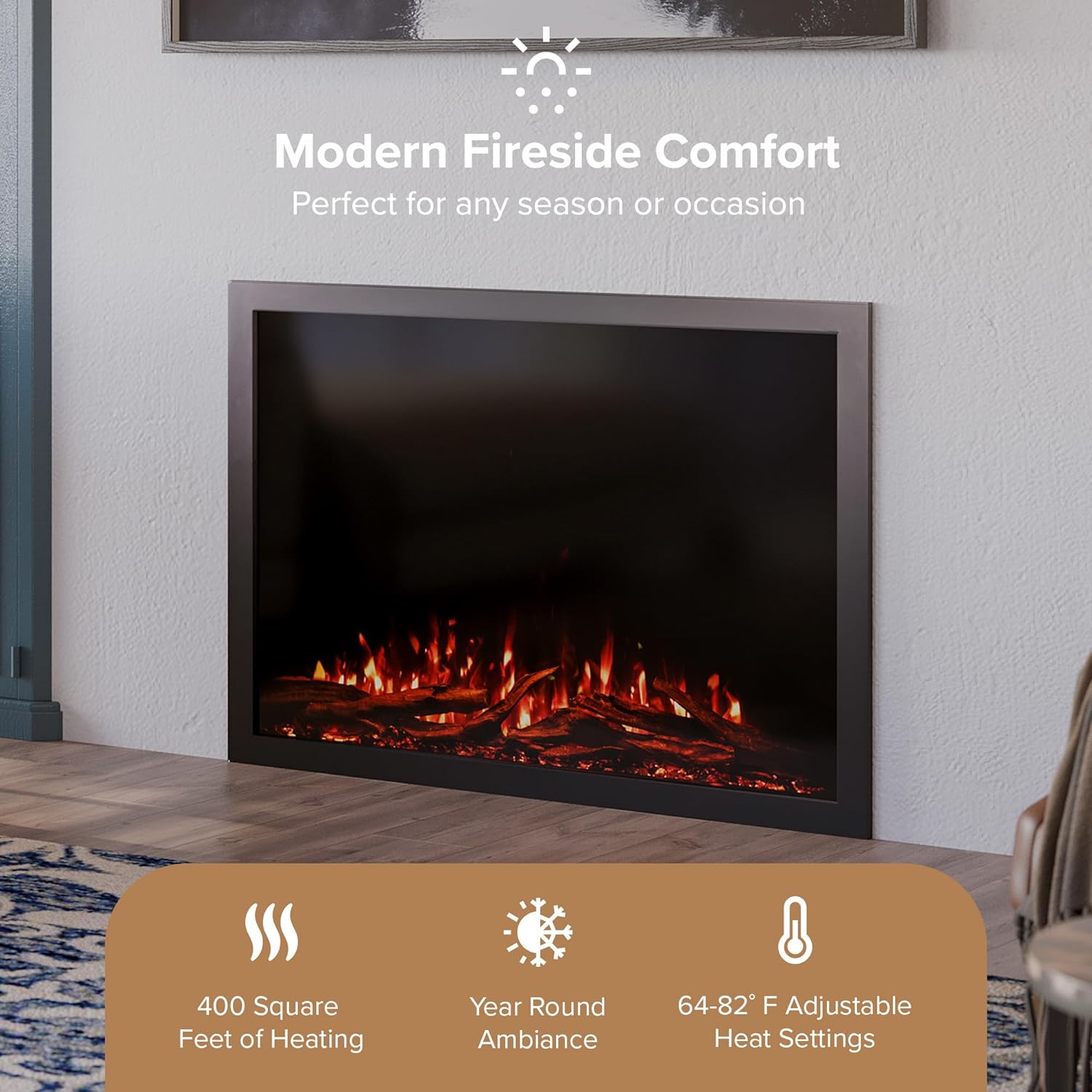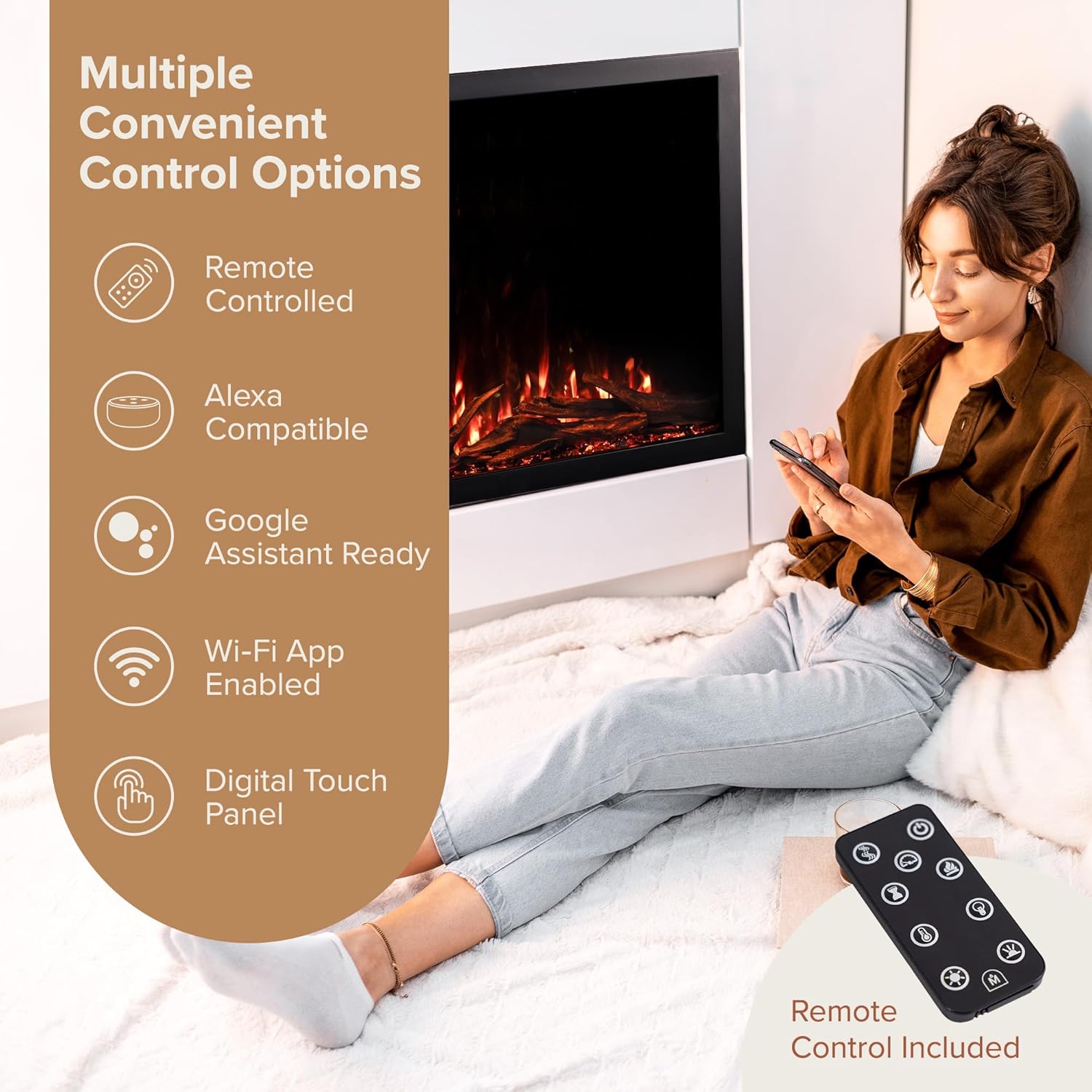 Bring warmth and sophistication to your space with the Modern Ember Highmark Traditional Built-In Electric Fireplace. Designed for a seamless, built-in look, this self-trimming unit offers both classic charm and modern innovation. The concrete-look firebox backdrop adds a contemporary touch, while the driftwood log set and shimmering glacier crystals create a stunningly realistic flame display.Customize your ambiance with 10 flame colors, 4 flame speeds, and 5 brightness settings - plus 10 ember bed and downlight color options for an immersive experience. The WiFi-enabled smart controls allow you to adjust settings via the Tuya app, remote control, or digital touch panel, while voice commands through Alexa and Google Home offer hands-free convenience.Perfect for both homeowners and trade professionals, this unit provides supplemental warmth for up to 400 sq. ft. with a thermostatic heater that lets you set temperatures between 64°F–82°F in precise 2° increments. Use it with or without heat to enjoy the ambiance year-round. Designed for DIY-friendly installation, it’s a perfect upgrade to any living space.