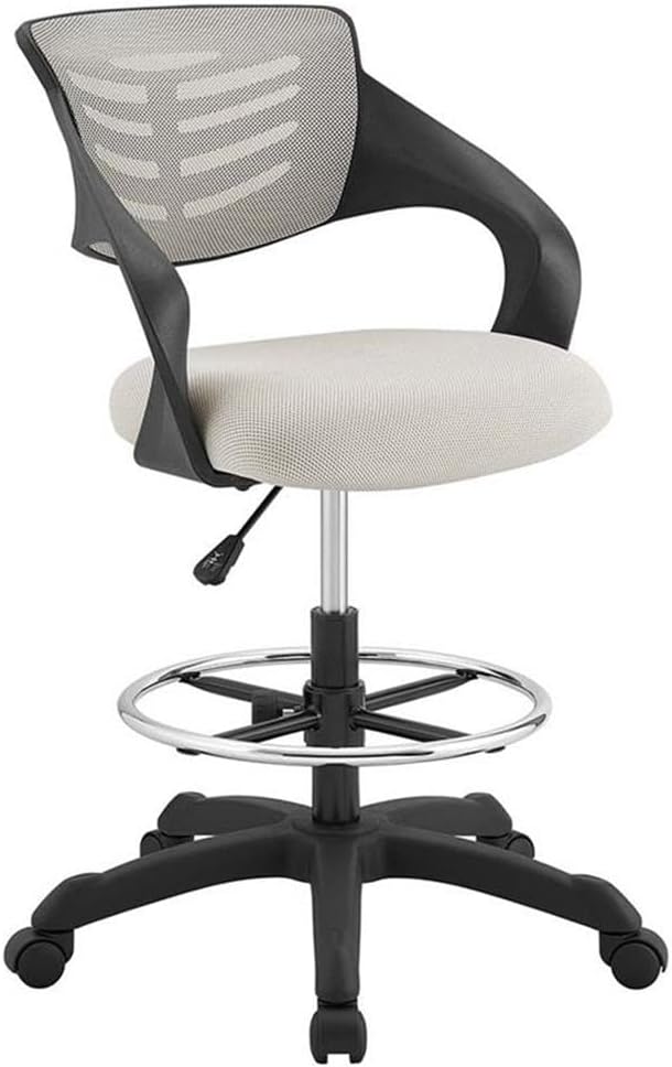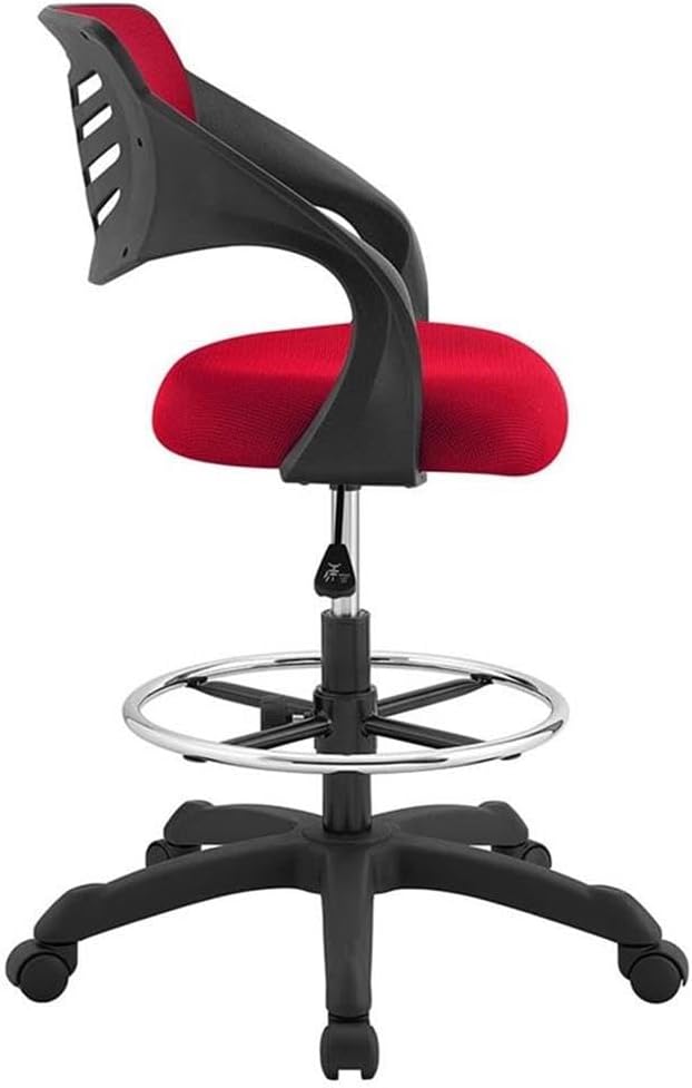 Energize your office decor with . This sturdy nylon frame drafting chair comes with a breathable mesh back which combines passive lumbar support and cooling comfort. Spiraling armrests imbue a creative vibe, while the densely padded mesh seat and adjustable foot ring keep you ergonomically supported. Complete with one-touch height adjustment, full 360-degree swivel, and five dual-wheel casters for natural movement of either carpeted or hardwood surfaces, is a drafting stool that stands to be at the forefront of your work endeavors.Features :- Material: Mesh fabric, nylon, vinyl- Finish: Red, black, chrome- Sleek modern drafting chair- Tall drafting chair- Padded mesh seat/nylon frame- Standing desk chair- Extra tall cylinder/full swivel- Height adjustable foot ringSpecifications :- Product Dimensions : 43"H x 25"W x 24.5"D- Product Weight : 22 lbs- Weight Capacity : (Chair) 331 lbs