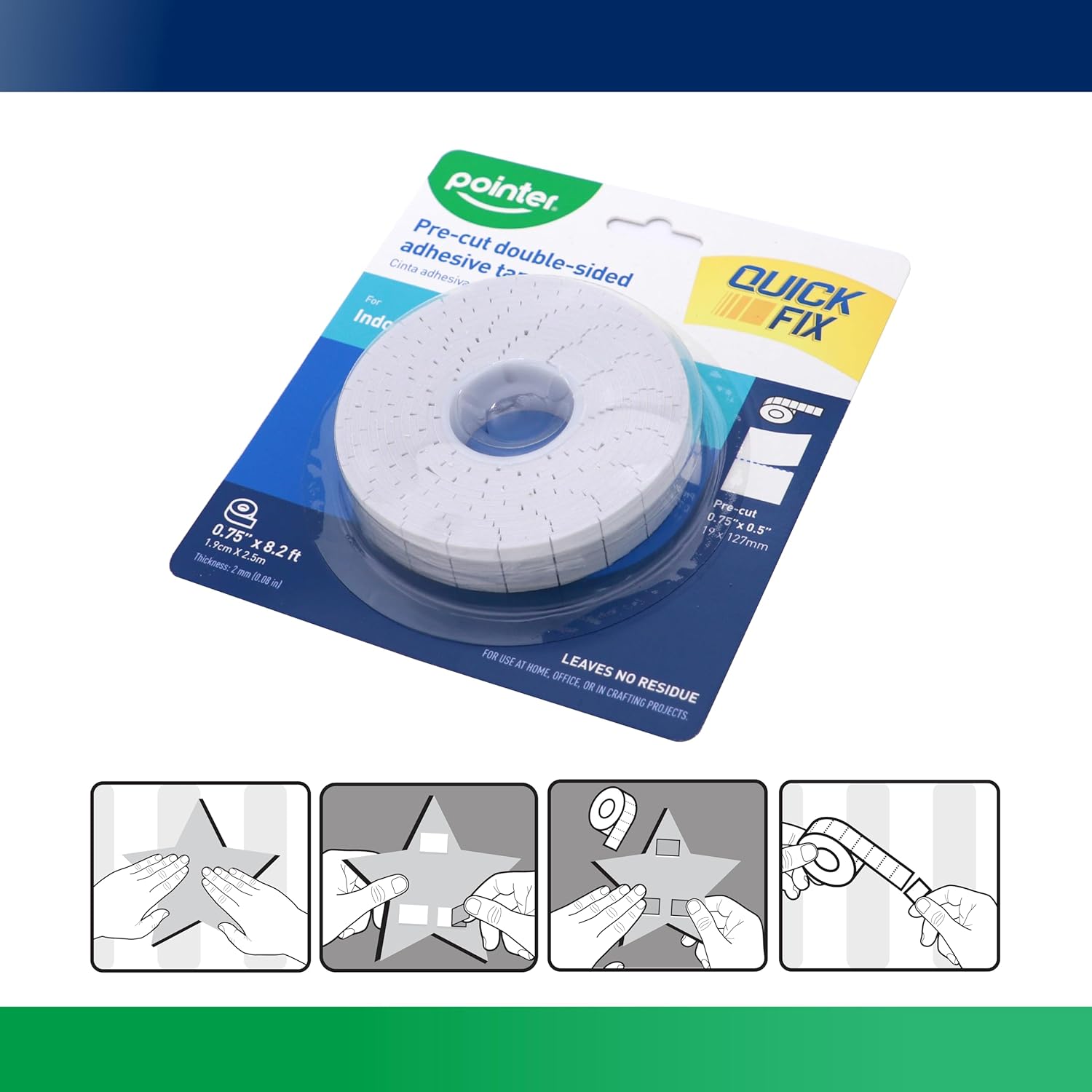 Pointer Quick Fix Pre-Cut Double-Sided Adhesive Tape, 3/4(0.75") x 8.2 ft,1.9cm x 2.5 m, Indoor Use, No Residue. 1 Roll (Pack of 36)