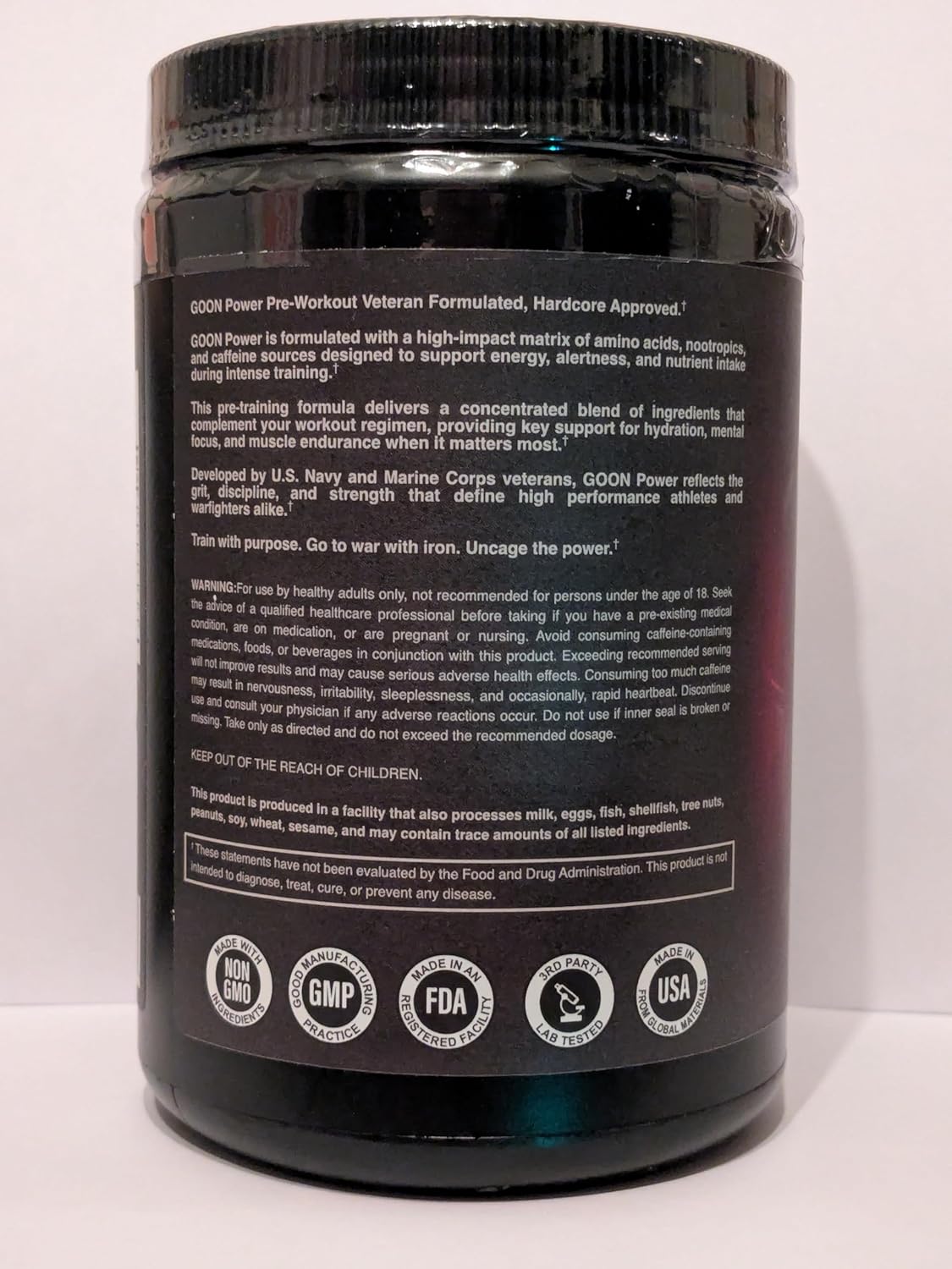 CONTROLLED POWER FOR SERIOUS TRAINING GOON Power Raspberry Rampage Pre-Workout is designed for athletes who demand strong energy, focus, and endurance without unnecessary fillers or gimmicks. WHAT YOU’LL FEEL A fast surge of energy with sustained performance support to help power through intense training sessions from warm-up to final set. WHAT’S INSIDE Formulated with L-Citrulline, Beta-Alanine, Taurine, L-Tyrosine, and a 350mg caffeine system combining caffeine anhydrous and caffeine malate. HOW TO USE Mix one scoop with water 20–30 minutes before training. Assess tolerance before use. Not intended for beginners or those sensitive to caffeine. BUILT WITH PURPOSE Proudly produced by a Service-Disabled Veteran-Owned Small Business. Made in the USA in a GMP-compliant facility with a focus on quality and consistency.