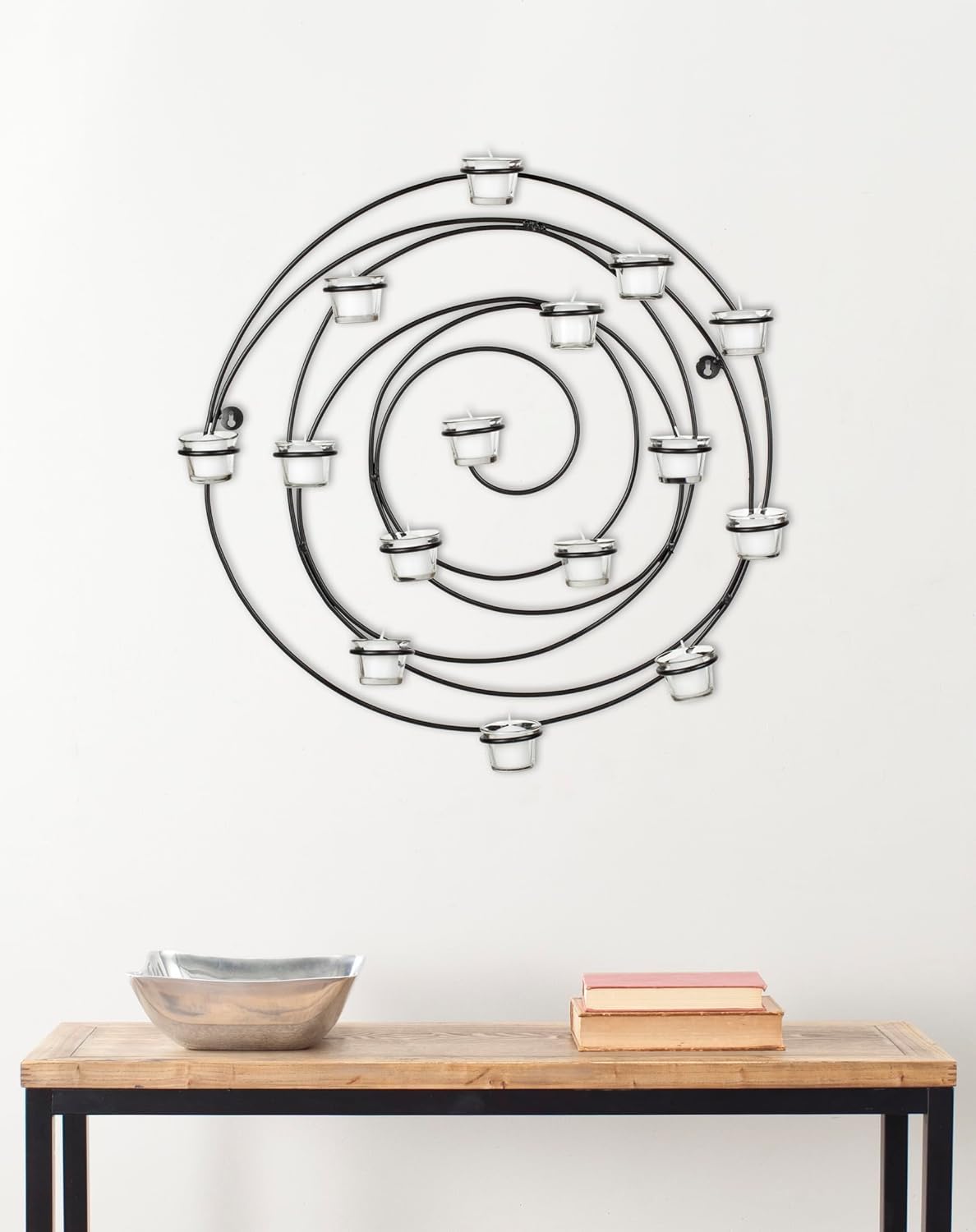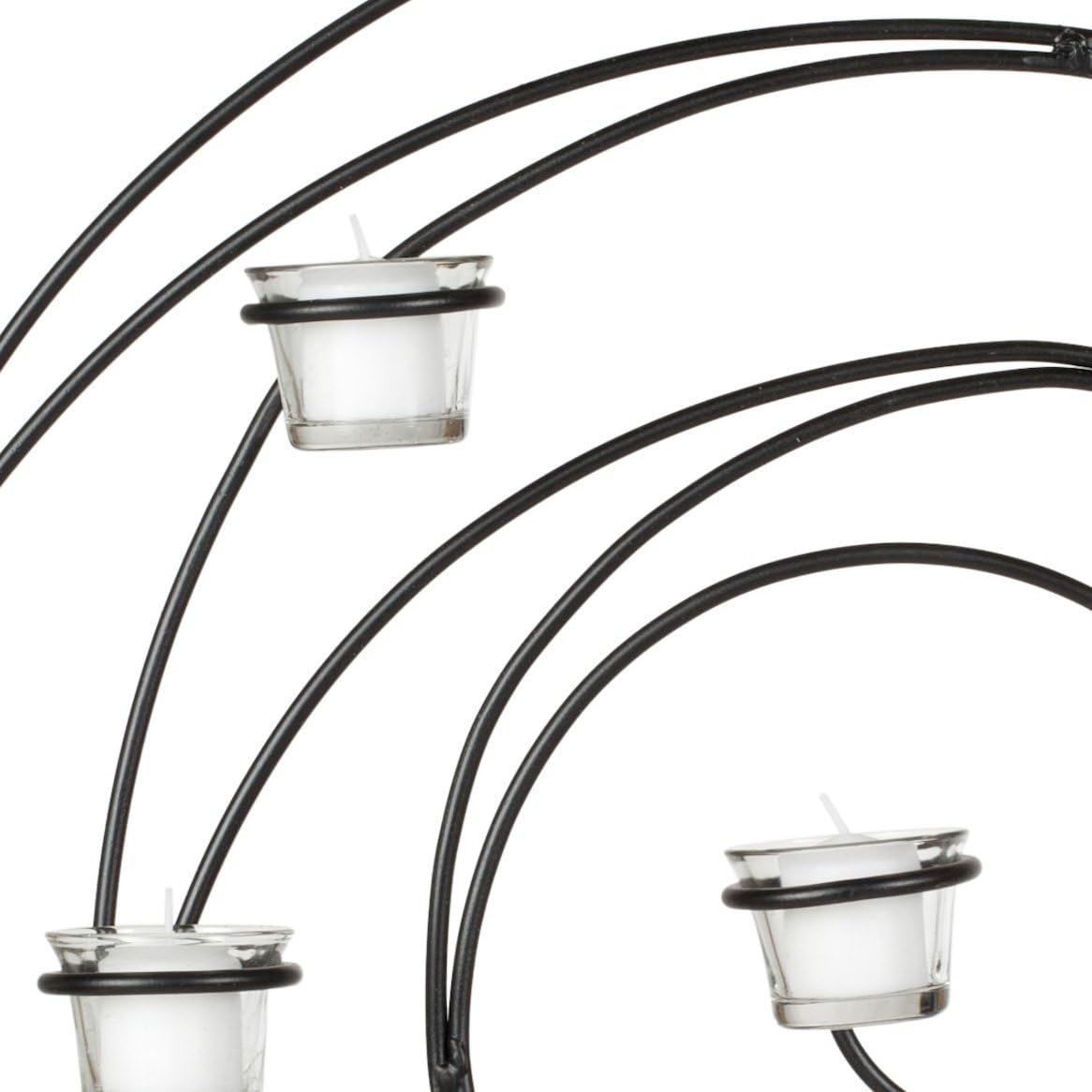Add a stunning accent to your home with the Safavieh Wall Art Collection Florished Spiral Candle Holder Wall Sconce. Contemporary spiral design inspired this timeless wrought-iron wall sconce. Fifteen shallow candle cups and a black finish will sure to brighten up any room. This wall sconce works perfectly as a standalone piece, or give a personal touch with multiple units to fill your wall. Beautifully crafted from iron and glass, this easy-to-hang decorative accessory will look great in any room. This sconce measures 23.6 inches high by 23.9 inches wide by 3.9 inches deep.