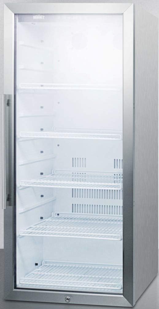 Summit Appliance SCR1006CSS Commercial Glass Door 22" Wide Beverage Merchandiser with Digital Controls, Auto Defrost, Digital Thermostat, LED Lighting, Lock and Stainless Steel Wrapped CabinetThe SSCR1006CSS offers a full 9 cu.ft. storage capacity with a full display from top to bottom. The user-reversible double pane tempered glass door includes a factory installed lock and attractive stainless steel trim. This unit has a fully wrapped stainless steel cabinet for a professional look with lasting.Key FeaturesCommercially ETL-S listed to NSF-7 standardsStainless steel trimmed glass door offers an attractive display of stored itemsFactory installed lock provides security you can count onElectronic controls allow precise temperature managementRearrange refrigerator space to accommodate all sizes or remove shelves for simple cleanup SPECIFICATIONSOverviewHeight of Cabinet: 48"Height to Hinge Cap: 48.5"Width: 21.25"Depth: 22.5"Depth with Handle: 24.5"Depth with door at 90°: 42"Capacity: 9 cu.ft.Defrost Type: AutomaticUS Electrical Safety: ETLCanadian Electrical Safety: ETL-CSanitation: ETL-SAmps: 2Voltage/Frequency: 115V AC/60HzWeight: 115 lbs.Shipping Weight: 135 lbs. Refrigerator FeaturesDoor Swing: RHDReversible: YesShelf Type: WireShelf Qty: 5Adjustable Shelves: YesThermostat Type: DigitalFan Type: InteriorRefrigerant Type: R600aRefrigerant Amount: 1.24oz.High Side PSI: 270.0Low Side PSI: 103.0Level Legs Qty: 4Interior Light: YesTemperature Range: 34°F to 43°FInterior: 42"x18"x16.25"Compressor Step: 8"x18"x4"