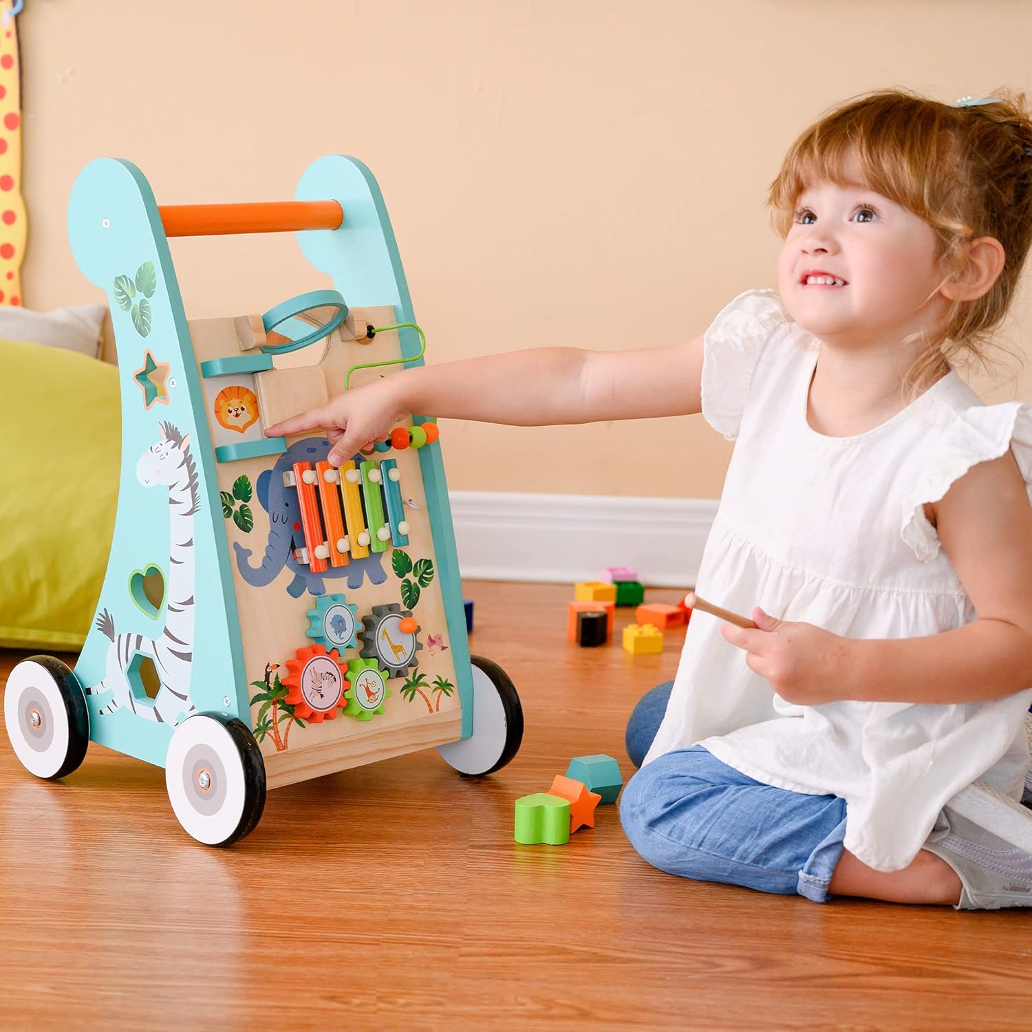 The baby walker comes with several attractive activities and have a small storge space, make your child's engaging and memorable. Acativities include bead maze, xylophone, spinning gears, shape sorter, and shape slider. This sturdy hardwood baby walker is easy to assemble with, just a screwdriver and illustrated instructions. Made by natural wood , makes your baby move safely. DIMENSIONS: 12.52" L x 11.42" W x 20.0" H. Weight: 6.71 lbs.